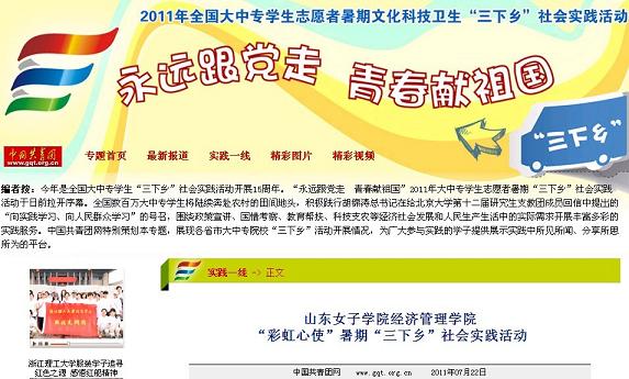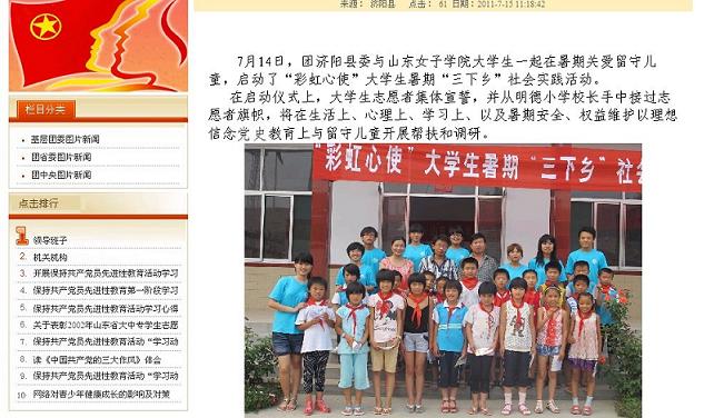 我院的暑期“三下乡”活动引起了较大的社会反响。中国共青团2011年暑期“三下乡”活动--“实践一线”专题报道了“彩虹心使”志愿者服务队的活动情况,共青团中央、山东共青团、济南共青团、法制山东网、山东学校工作网站、济阳新闻、仁风中心小学网站等多家网站和媒体对“彩虹心使”进行了报道宣传,进一步呼吁了全社会共同关注、关心留守儿童,为关爱活动营造了浓厚的舆论氛围,有效的展现了我院学子的良好的精神面貌。