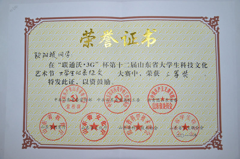 【喜讯】我校欧阳祯同学在大学生科技文化艺术节“大学生记录征文”大赛中,荣获三等奖