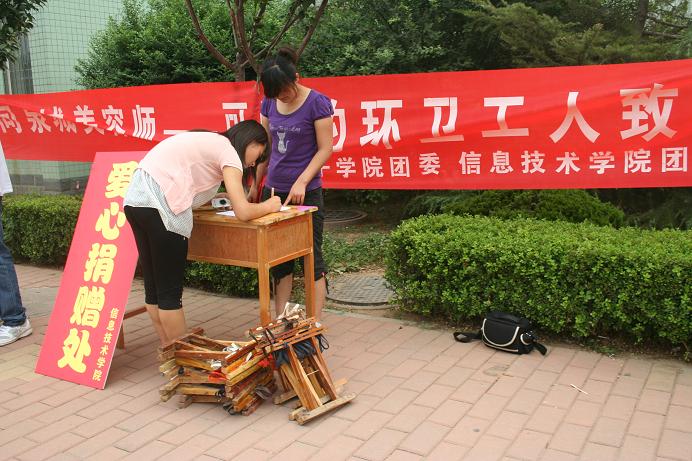 在《齐鲁晚报》联合济南市城管局共同发起的征集保洁员歇脚点活动进行地如火如荼之际,歇脚点建了4000余处,但是保洁员休息时却没法坐下来。闻此讯,6月16日始,山东女子学院团委、信息技术学院在餐厅西门联合开展了为保洁员捐马扎活动。