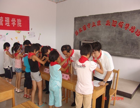 启动仪式上,留守儿童向各位领导敬献红领巾。明德小学校长霍纯涛在讲话中表达了对我院志愿者服务队的热烈欢迎,并呼吁社会各界人士积极参加到关爱留守儿童的社会实践中来。我院通过志愿者代表发言、全体志愿者集体宣誓的方式,表达了同学们圆满完成本次暑期社会实践的决心。