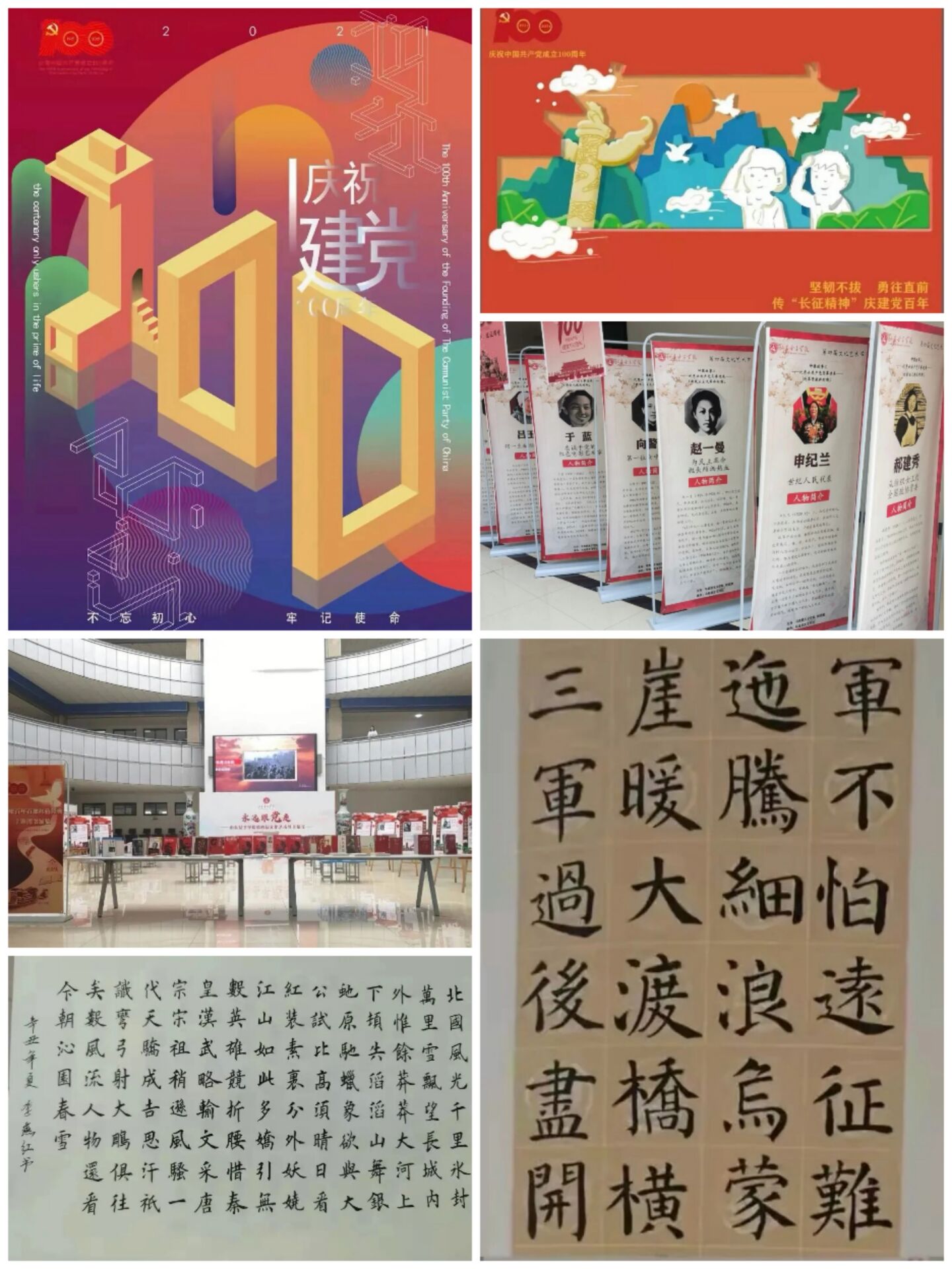 百年恰是风华正茂,百年初心历久弥坚。江河万里,神州大地,一百年的党史灿烂辉煌。艺术设计学院“永远跟党走”庆祝建党100周年主题艺术展中,女院学子们用不同形式、从不同视角表达了对党和国家的礼赞,对美好生活的热爱以及对未来的无限畅想。马克思主义学院“坤德故事汇—优秀女共产党员事迹展”突出展示优秀女共产党员们为新民主主义革命、社会主义革命和建设、改革开放和社会主义现代化建设做出的重要贡献。图书馆“品味百年百部红色经典”主题书展,以多元化视角全面的展现中国共产党的百年历程,营造书香女院的文化氛围,用党的光荣传统和优良作风坚定信念、凝聚力量,用党的实践创造和历史经验启迪智慧、砥砺品格。庆祝建党100周年书法艺术作品展中,30幅精选作品各展所长,各具特色,凝聚着广大师生热爱党、拥护党、永远跟党走的赤诚与担当,饱含着女院师生对中国共产党百年华诞的深深祝福。