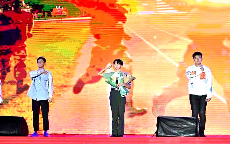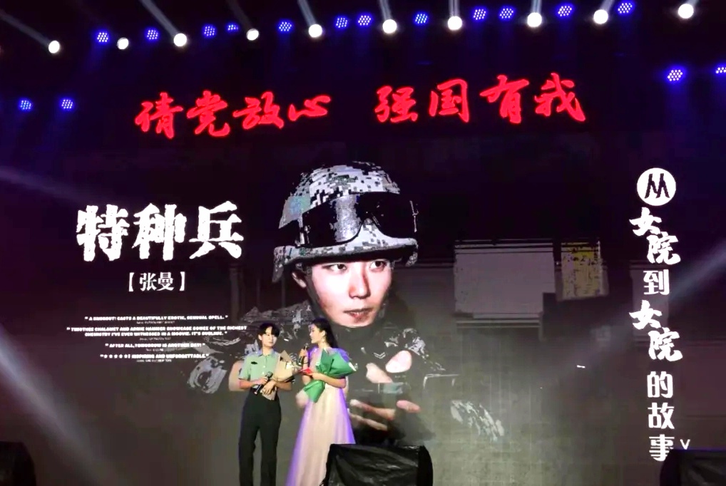 “从女院到女院的故事”采访退役特种兵张曼同学,她服役期间担任狙击手、参与野外濒海驻训和伞降实跳的经历以及她“敢和自己较劲、敢向男兵叫板、敢上战场打仗”的女兵精神,激发了女院学子用热血奉献祖国的斗志,将整场晚会推向高潮。