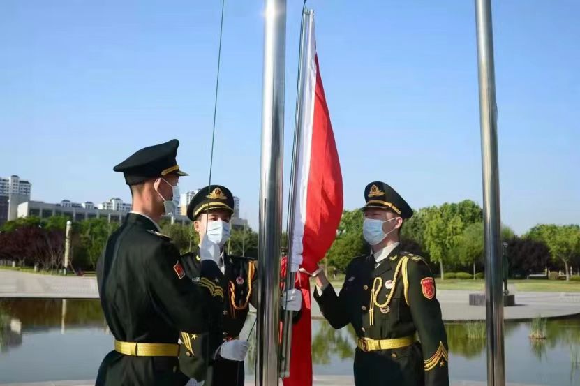 早晨7点,伴随着雄壮的国歌声,由学校英姿军事协会国旗护卫队同学们护送的五星红旗,在朝阳中冉冉升起,青年团员代表在国旗下发出《燃五四之火,筑青春之梦》的青春誓言,展现新时代青年砥砺奋进跟党走的坚定信心和决心。