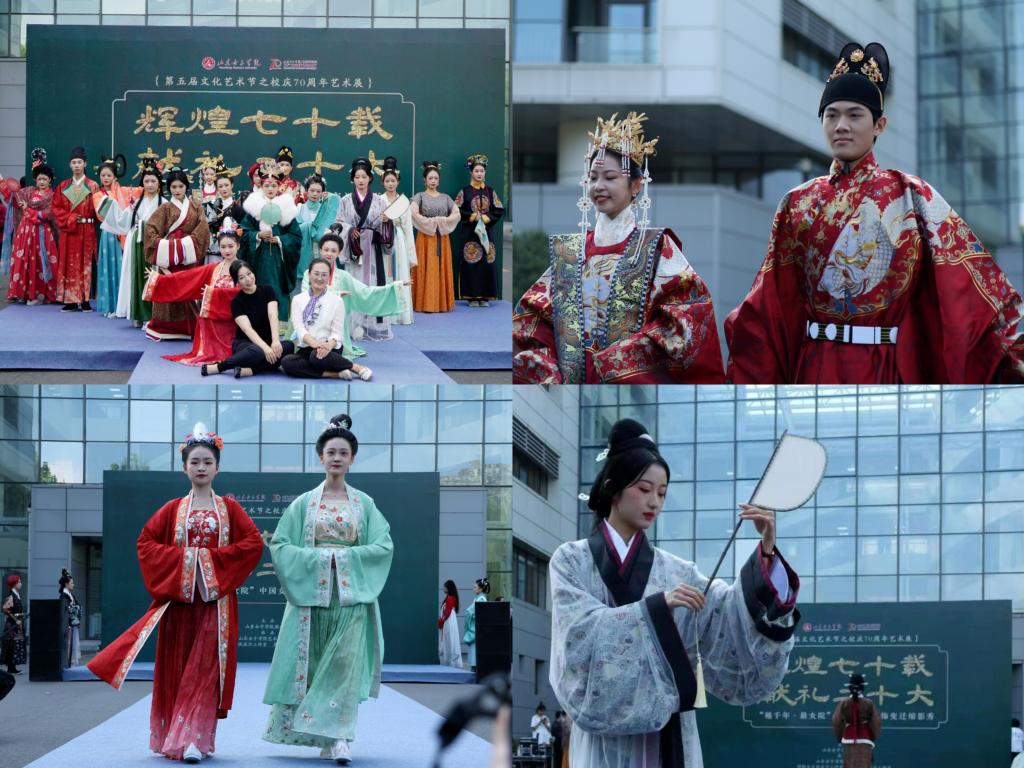 用中华优秀传统文化浸润心灵。校庆70周年艺术展给同学们带来一场文化与艺术交融碰撞的盛宴。伴随着悠扬的古琴声,“越千年·最女院”中国女性服饰变迁缩影秀拉开帷幕,以时间为序,秦汉、魏晋南北朝、唐、宋、明、清以及近代,代表中国时代文化变迁的女性服饰一一登场。精良服饰、精致妆容、精美饰品映入观众的眼帘,于古韵古香中体现女性服饰变化,见微知著探索过往今昔历史悠长。舞台上同学们身着由学校艺术设计学院明镜台古风设计工作室和灵犀旗袍设计工作室制作的服饰,头戴花簪花冠,充满历史沉淀的传统服饰让观众眼前一亮,留下了经久不息的掌声?!按竺琅骸鄙阌白髌氛?、“巧手巾帼·筑梦明天”女性手工艺主题展览等优秀的艺术设计作品、精致的手工艺产品,以艺术表现形式为载体,让同学们感受到了深厚的中华优秀传统文化的底蕴,也体会到了新时代女院人奋发进取的力量源泉。
