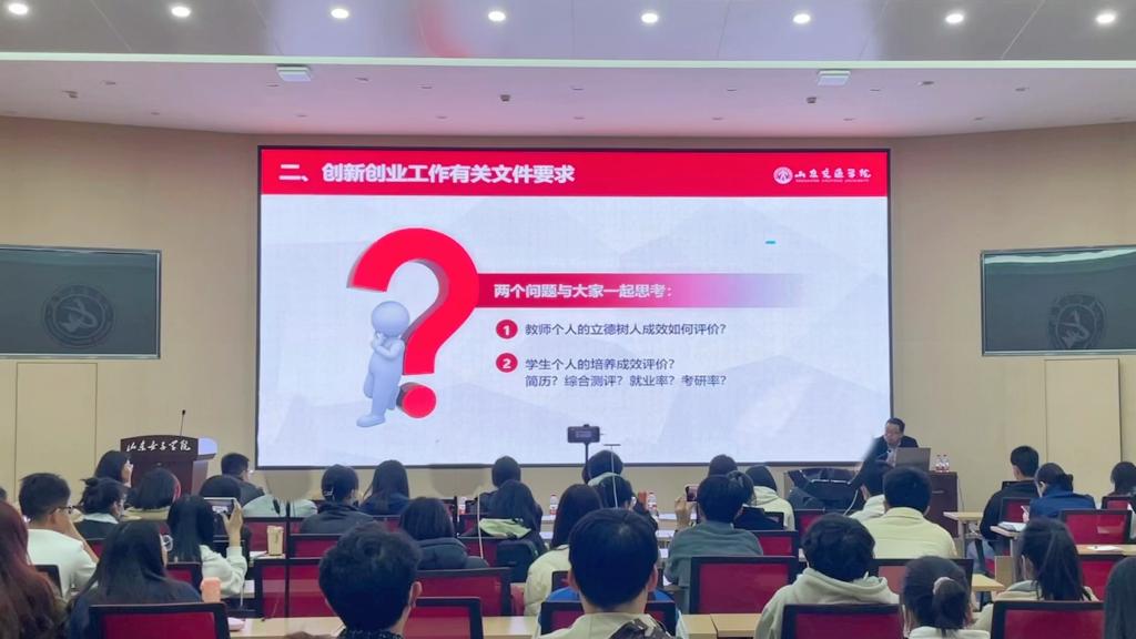 讲座开篇,吴硕抛出“教师立德树人成效应如何评价?”“学生人才培养成效如何评价?”两个问题,引发在座师生思考。他从创新创业有关文件要求、“挑战杯”竞赛情况介绍、做好大赛的几点思考等方面层层展开,以山东交通学院工作情况、兄弟高?;窠卑咐确岣幌晔档淖柿衔劳校晗阜治隽巳绾瓮平葱麓匆迪钅拷逃?、科技、人才“一体三翼”发展,强调了“挑战杯”赛事对学校建设发展、一流学科申报、教师个人发展、学生综合成长等方面不可估量的重要作用。整场讲座内容高度凝练又内涵深邃,从政策支撑、赛前准备、项目书撰写、团队构成、ppt制作、指导教师价值发挥等方面,对赛事进行了全方位的解读,在场师生收获满满。