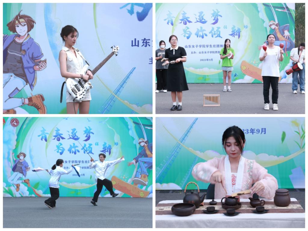 活动现场气氛热闹,人头攒动。各社团结合自身特色,通过展板宣传、互动体验、才艺表演、成果展出、趣味闯关等多种形式,展现了精彩纷呈、各具魅力的社团风采。明镜台汉服社、棣棠国学社、大学生茶道艺术团、灵熙旗袍社团、传统文化学会的社团成员们身着中式服装出场,襦裙霓裳,曲裾轻舞,让人对中华优秀传统文化的传承心向往之;青年志愿者协会展位前,通过开展校内外志愿服务获得的累累硕果,吸引了一大批学生的关注;梅花桩武术协会带来一场精彩的视觉盛宴,散打、刀、枪、剑和棍的表演让学生们目不转睛;吉他社“入??诶侄印钡翘料嘁徽垢韬?。各学生社团精心筹备、各展所长,让同学们“沉浸式”“互动式”的近距离感受了一场女院第二课堂文化活动的盛宴,立体化展示出学校青年学生的多彩文化生活和向上青春风采,也为新同学的自我发展和综合素质提升提供了平台。