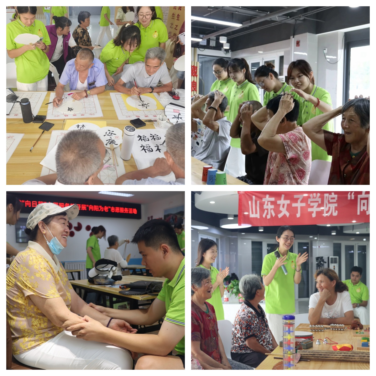“让老年人能有一个幸福美满的晚年”一直是习近平总书记心中的牵挂,也为女院学子社会实践指明了前进航向。在济南市长清区常春藤社区,社会与法学院“向日葵”志愿服务队开展“经络之旅疗愈夕阳,健康之脉养生智慧”中医养生系列活动,以校园青春力量,倡导尊老、爱老、敬老、助老新风尚,将生命健康知识注入乡村、融入社区基层,打通健康社会最后一公里。实践队员们将“健康养老”“智慧养老”融入到陪伴老人的项目中,开展认知症早期筛查与幸福度调研,通过“朝暮音乐剧场”音乐疗法、“乐龄玩趣坊”乐龄游戏、“岁月智趣轩”老年玩具等特色个性化措施预防老年认知症,帮助老人更好地应对可能遇到的健康风险。在长清区归德街道,实践队开展“老友记”趣味运动会、艾草锤制作、非遗漆扇制作和书法小课堂活动,把健康养老与中华优秀传统文化传承融合起来,鼓励长者积极参与文娱活动、维持社会互动、拓宽社会交际网络,成功探索了新型养老助老社会实践模式。在德州乐陵市花园镇大韩村“暖心食堂”,艺术设计学院“美丽乡村建设”志愿服务队为老人送上爱心水饺,将新型诈骗故事讲给老人们听,带学带练健康操,为当地老人提供了一场身心健康的盛宴。健康养老是女院特色专业,受到社会广泛关注,女院学子将用实际行动展现青年责任担当,为老年社会贡献青年力量。