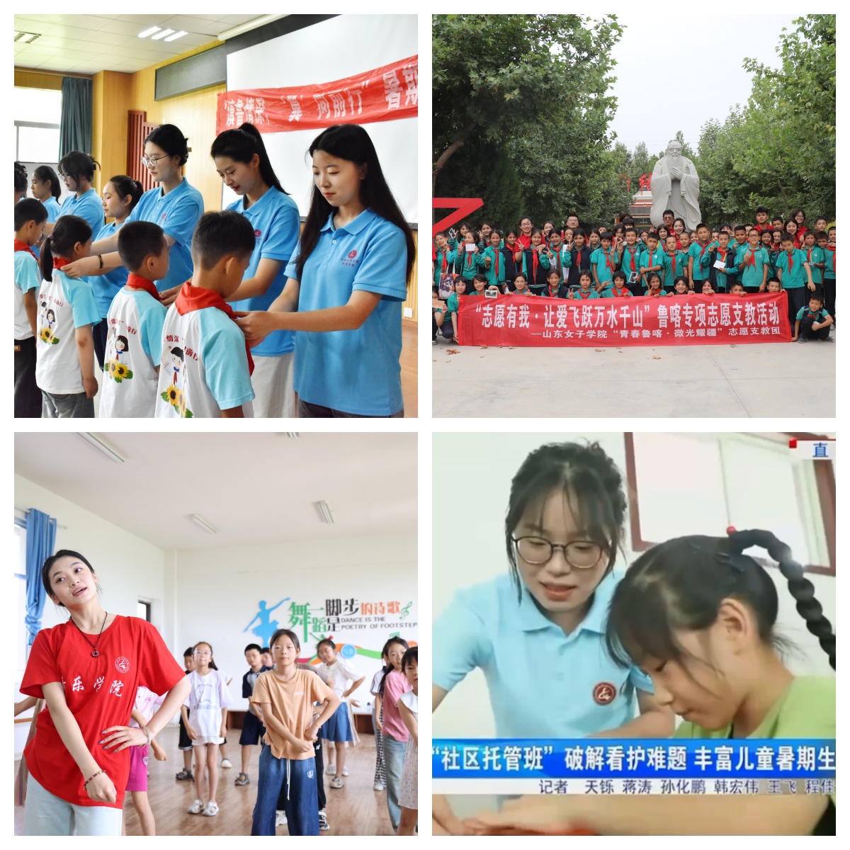 云南华坪女高张桂梅校长曾说过“女孩子受教育可以改变家庭三代人的命运”,这让同为女子院校的青年学子倍受鼓舞、倍感责任重大。在张桂梅事迹的指引下,工商管理学院“青春鲁喀· 微光耀疆”志愿支教团走进新疆喀什地区英吉沙县第一小学,为孩子们带去知识与关爱的同时,播种民族团结精神与爱国情。社会与法学院遇“健”你志愿服务健康队在在济南市儿童福利院开展了一场充满温情与关爱的志愿服务活动?!拔颐堑哪勘旰芗虻?,那就是让每个孩子身体更加健康,心灵更加坚强?!倍映で鼗劳怠?strong>女院青协“团小青”志愿服务队在济南市长清区乐天创科社区、紫薇阁社区社区托管班暖心支教活动,“五次方”课业辅导不仅解决了家长的暑期带娃难题,也让孩子们拥有了一个自律、充实、快乐的假期生活,活动开展情况获山东卫视专题报道?!敖烙逃绱濉OMü庑┛纬?,能够开拓孩子们的眼界,拓宽他们视野,帮助他们树立正确的审美观?!?strong>音乐学院“音为梦想 乐舞童心”社会实践队队员胡耀军同学说。尽管条件艰苦,但看到孩子们快乐的笑容,队员们深感值得。教育学院“滇鲁情深,‘翼’同前行”暑期社会实践团赴云南宁蒗彝族自治县大兴镇小凉山学校,为孩子们量身定制了手工、彩绘、书法、舞蹈、话剧、体育等特色课程,用教育传递爱心,用爱心播种希望。