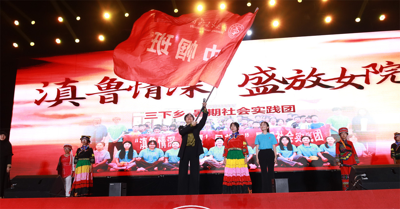 党委副书记、校长李光红为学校今年首次成立的“巾帼班”授班旗。巾帼班由来自云南6个民族的30名同学组成,就读于学前教育专业。她寄语同学们,铭记党恩、苦练本领,作为民族大团结的美丽使者,希望她们学成之后能够回馈家乡、回报祖国,成长为教育事业的中坚力量。