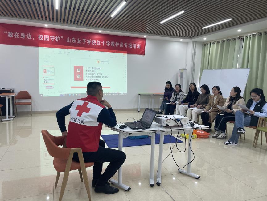 培训采用理论培训和实操演练相结合的方式,从师生需求出发,创新工作方法,组织多场次小班化“点单式”培训及2场报告厅大规模培训。培训现场,济南市红十字会讲师和助教通过情景式教学、现场教具演示、案例分析等,详细讲解心肺复苏、气道异物梗阻处理、AED使用、创伤救护等急救知识技能。现场演示环节,讲师结合模拟人、AED等设备为学员们进行了现场实操示范。